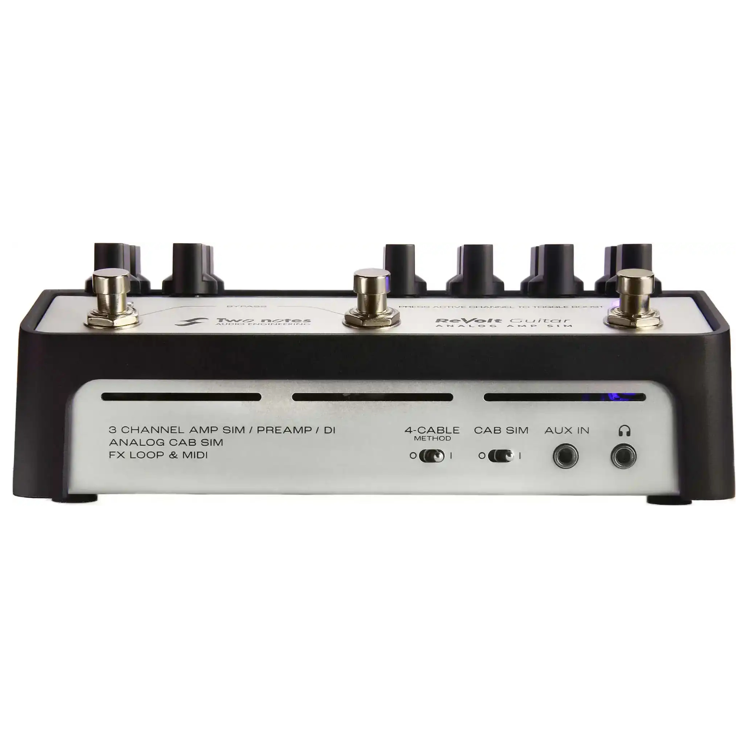 ReVolt Guitarは、オールアナログの3チャンネル・アンプシミュレーターです。Two notesのアンプシミュレーターの最新モデルとして、サウンドの基礎を究極のトーンで固め、機材の中心としての重要な役割を果たします。象徴的な3つのアンプからインスパイアされた基本のトーン、200Vの本物の真空管によるパワー、膨大なプレイスタイルへの対応、ODブースト回路などにより他を圧倒する魅力を備えています。