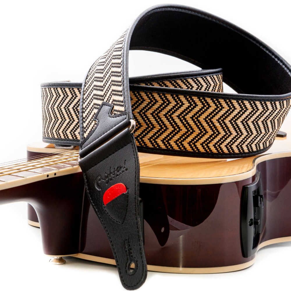 ZIGGYは、デヴィッド・ボウイの稲妻モチーフとロックンロールのエネルギッシュなジグザグをイメージしたマルチカラーのギターストラップです。