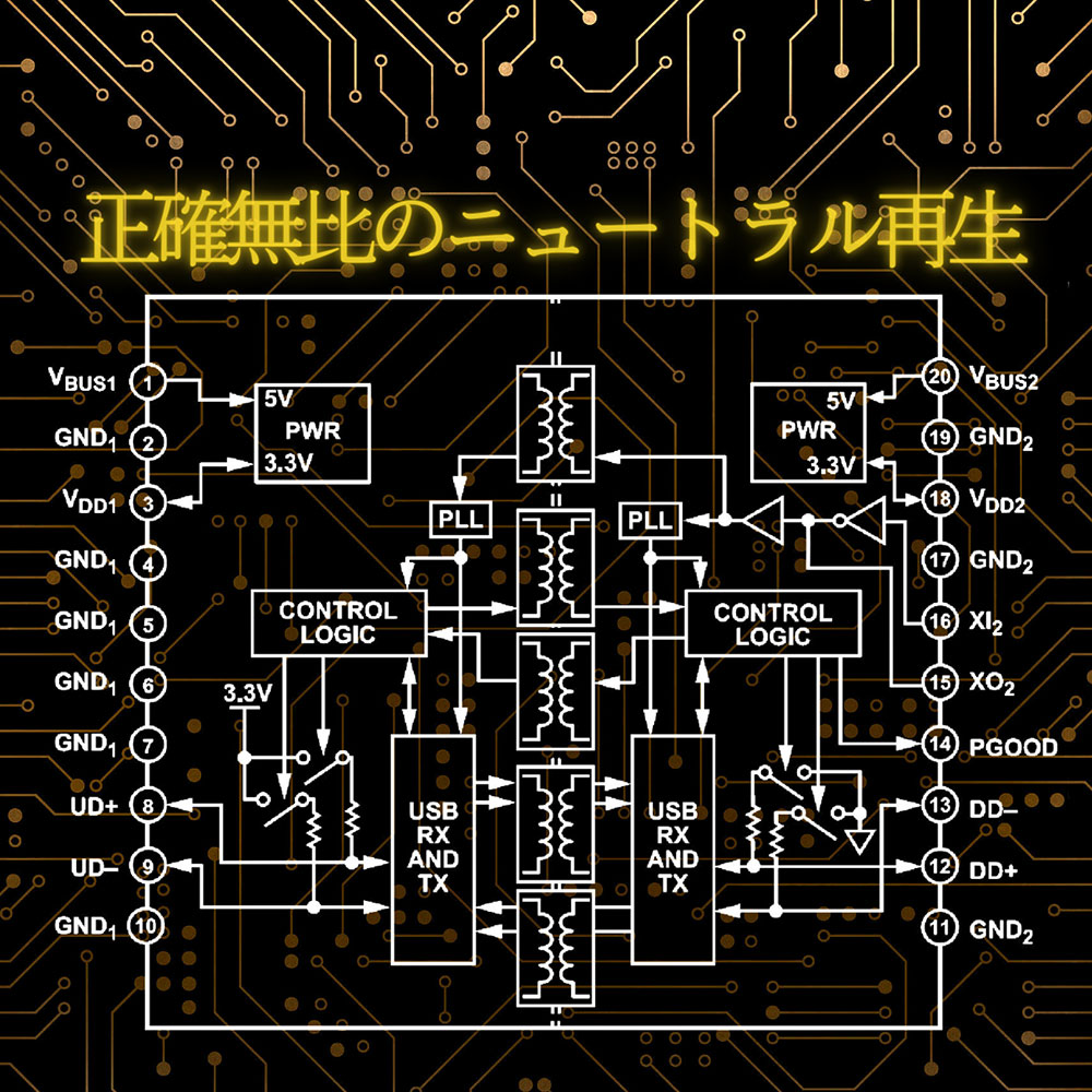 ADIのiCouplerデジタル絶縁技術をベースとしており、接続元の回路基盤から生まれる強力な電磁干渉を効果的に分離し、USBオーディオデータの信号整合性設計に従って、伝送エラーとパケット損失を回避した再生を実現します。高速データキャリブレーション、波形整形、ジッタリング抑制はAccusilicon AS318シリーズの超高精度フェムト秒水晶発振器を通じて内部で実行されるため、出力元の端末性能への依存が大幅に軽減されたこれまでにない正確で忠実な再生をご体験いただけます。