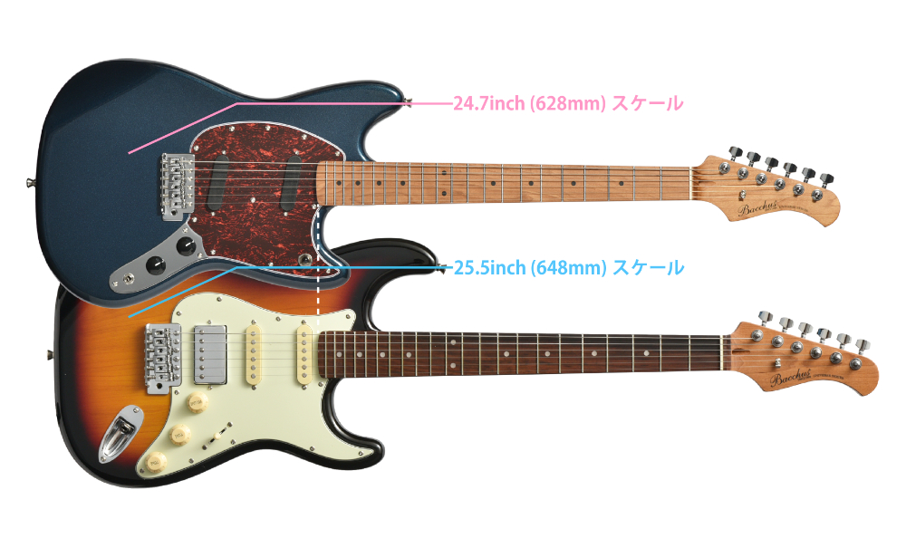 一般的なレギュラースケール(648mm)よりもやや短めな628mmのミディアムスケールを採用。画像の指板の長さだけを比べてもわかるように、通常のギターよりもスケール(ナットからブリッジサドルまでの距離)が短い仕様となっています。スケールが短くなることで弦のテンションが適度に緩み、押弦やチョーキングがよりスムーズに。演奏時の快適なフィンガリングをサポートします。