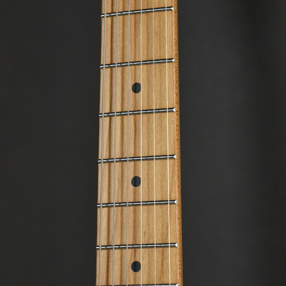 Bacchus Universe Seriesで多くのモデルに使用しているローステッドメイプルを「BMS」モデルに初採用。ローステッドメイプルとはメイプルを高温で加熱処理して材の中の水分や油分を揮発させることにより剛性を高めた材で、ネックに使用されるとその効果は安定性だけでなくサウンドにも及び、豊かな生鳴りと経年変化したビンテージのようなこなれたトーンを生み出します。
