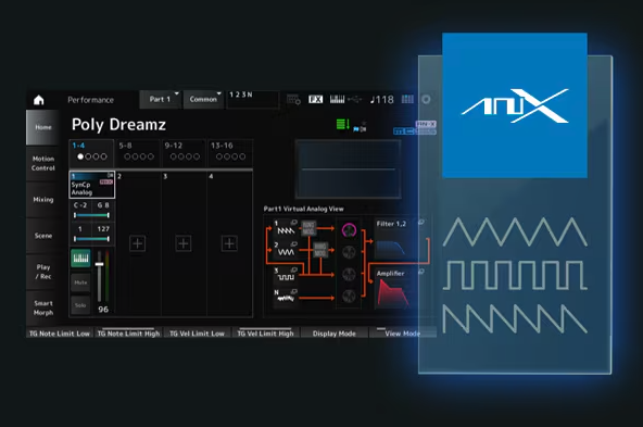SYNTHやEFFECTのパラメーターをダイナミックにオートメーションし、テンポに同期させることもできるモーションシーケンサー、ひとつの動きで膨大なパラメーターを一括に動かすことができるスーパーノブ、A/D Inputや他のパートからの音声信号によってサウンドをモジュレートすることができるエンベロープフォロワー。これらのMotion Control機能は、AN-X/FM-X/AWM2音源との組み合わせ、相互作用により、様々な方法でサウンドを生み出す画期的な音源システムを構築しています。