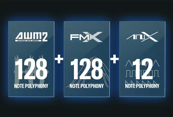 | 音源方式 | Motion Control Synthesis Engine AMW2: 最大 128 エレメント FM-X: 8 オペレーター、88アルゴリズム AN-X: 3 オシレーター、1ノイズ | Motion Control Synthesis Engine AMW2: 最大 128 エレメント FM-X: 8 オペレーター、88アルゴリズム AN-X: 3 オシレーター、1ノイズ | Motion Control Synthesis Engine AMW2: 最大 128 エレメント FM-X: 8 オペレーター、88アルゴリズム AN-X: 3 オシレーター、1ノイズ | |