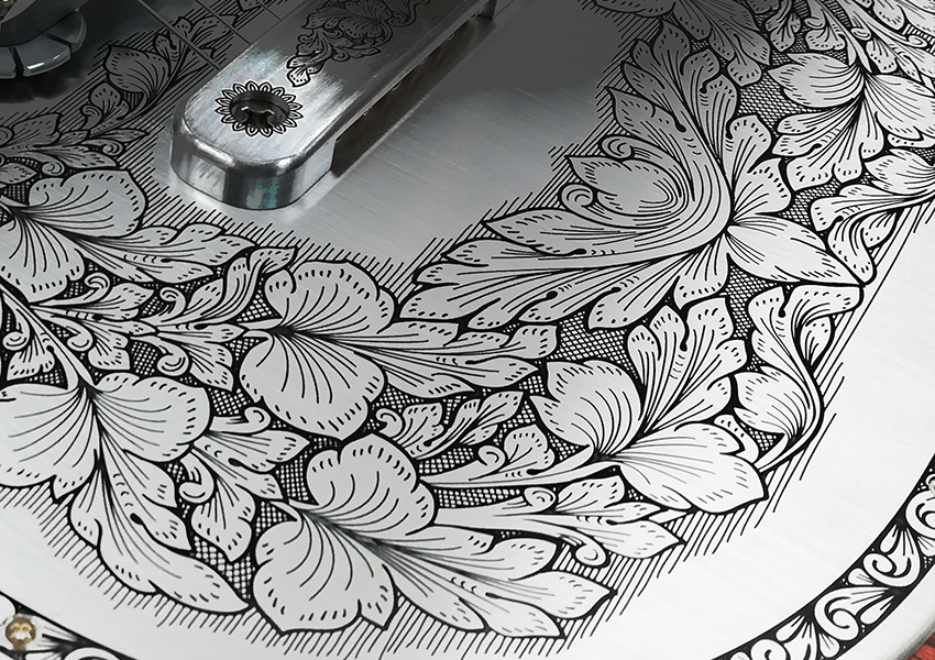 同様にアルミ合金を用いたヘッドのダイアモンド・エンブレム、トラスロッド・カバー、テイルピースやピックアップ・リングをはじめ、アウトプット・ジャック・プレート、コントロール&スイッチ・バック・プレートに至るまで彫金を施しています。