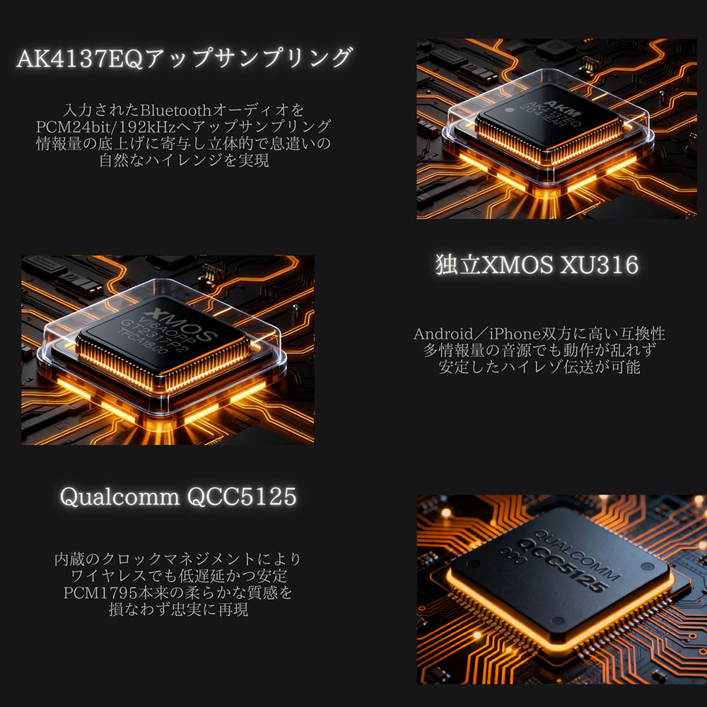 Qualcomm QCC5125は、デュアルコアCPUとデュアルコア Kalimba DSP を組み合わせたマルチコア構成のBluetoothオーディオSoCです。ワイヤレス伝送時の信号処理を安定させ、低遅延かつ滑らかな音の立ち上がりに貢献します。内部クロックマネジメントの精度を高めることで、処理の乱れや不要なノイズの影響を抑え、音場の見通しや背景の静けさが感じ取りやすい再生を実現。aptX、aptX HD、aptX LL、AAC、SBCといった主要コーデックに加え、高音質再生に対応するその他のコーデックにも広く対応できる設計となっており、大型アンテナの採用により障害物のない環境で約10mの安定した接続を確保します。