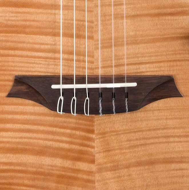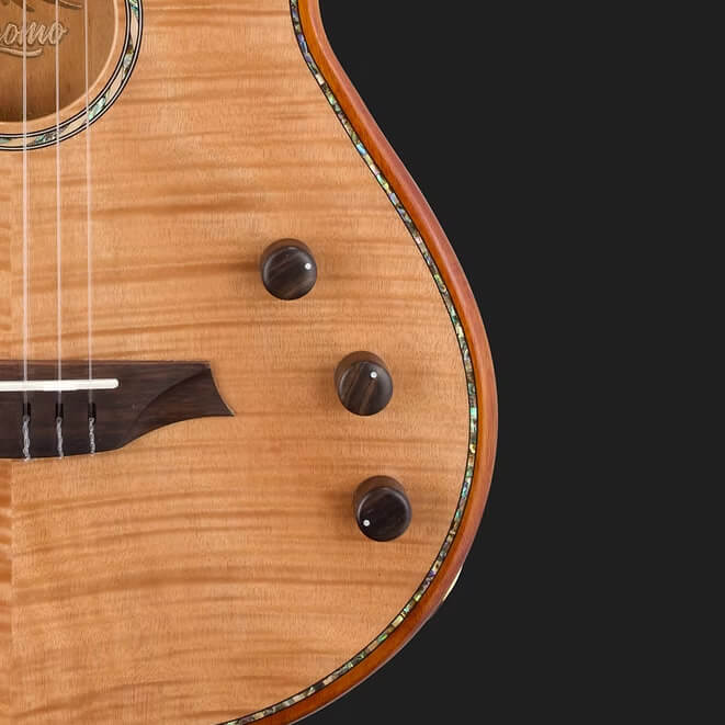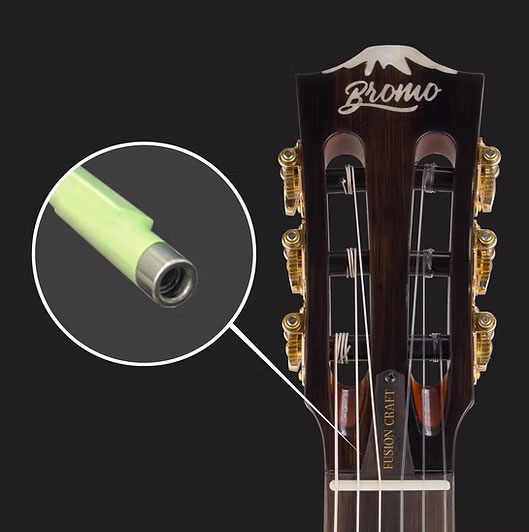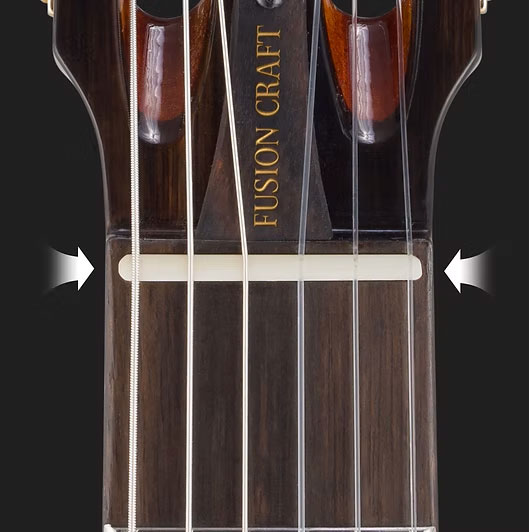 Fusion Craft ブリッジは、上質なアマラ・エボニーを使用しています。その硬度は高く、クリアでバランスの取れた音色を提供すると同時に、優れたサスティーンとチューニングの安定性のための耐湿性を確保しています。ナイロン弦専用に再設計されたこのブリッジは、象徴的なリバース・Bromoマウンテンのデザインはそのままに、弦のテンションを最適化し、レゾナンスを高める独自のドリル・パターンを取り入れています。強度と美しさを併せ持つこのブリッジは、楽器の際立った特徴となっています。