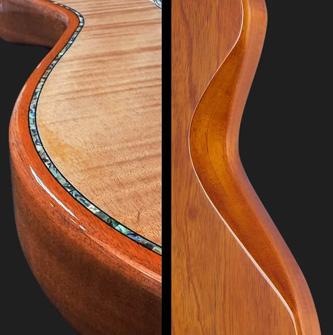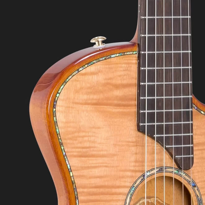 Fusion Craft の艶やかな仕上げは、5A Flamed Okoume材の見事な虎縞模様を美しく際立たせる独自の着色技術を取り入れています。この丹念な仕上げは、楽器の音色と演奏性を高めるだけでなく、ステージ上で聴衆を魅了する印象的なビジュアル・アピールを提供します。卓越した美的インパクトにより、忘れがたい印象を与えたい演奏家にとって、際立った選択肢となることでしょう。