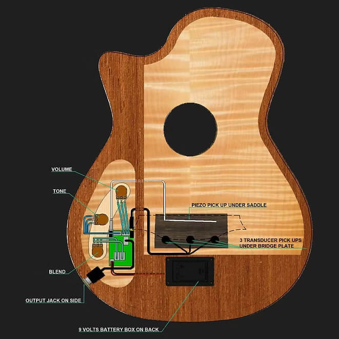 ピックアップシステムPiezo under Bridge Saddle + 3 Transducer Pick Up Under Bridge Plate.