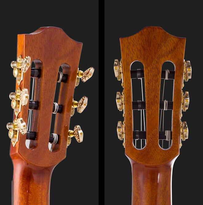 従来のスルー・スロット・デザインのナットでは、湿度の変化によりネックが収縮または膨張するため、ナットとネックの間に左右の凹凸が生じます。そのため、フレットを弾く手がこの部分を滑るときに不快感を感じることがよくあります。ブロモの革新的なコンフィ・ナット・デザインは、指板の両側にくぼみがあり、この凹凸と不快感を解消します。また、フレットを弾く手の動きに余裕を持たせ、非常にスムーズで滑らかな感触を実現し、優れた快適性を提供します。
