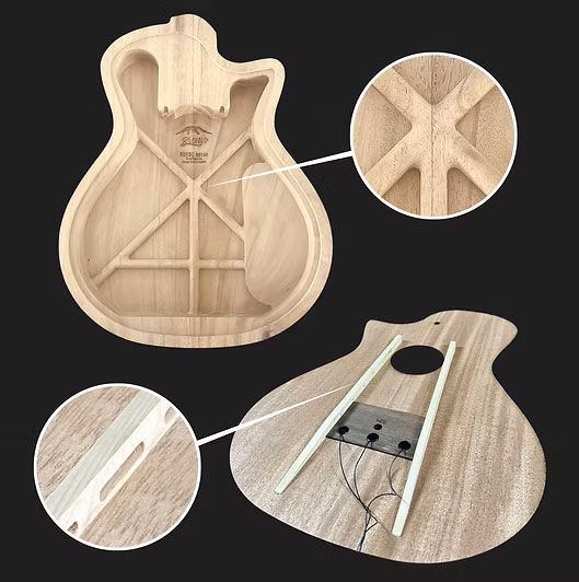 トーン・フロー・ブレーシング・システムは、柔軟性を保つトップと、特別にデザインされた「X」ブレーシングをバックに組み込んでいます。このデザインは、ボディの頑丈さを確保するだけでなく、レゾナンスを向上させ、ギターの構造全体で振動を増幅させます。この先進的な設計により、トーン・スペクトラムが向上し、より豊かでニュアンス豊かなサウンド特性を実現し、優れた聴覚体験を提供します。