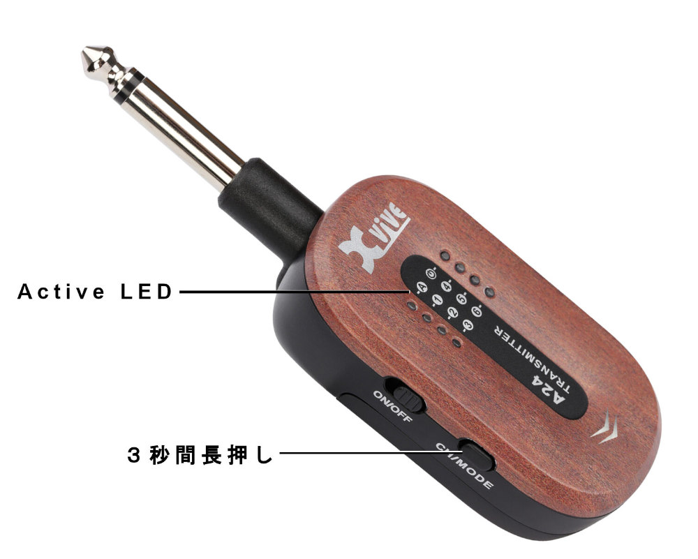 アクティブ/パッシブに対応しており、あらゆるタイプのピックアップに使用できます。アクティブピックアップを搭載したギターまたはベースを使用する場合は、トランスミッターのチャンネルボタンを長押しするだけで簡単にアクティブモードをオンにできます。