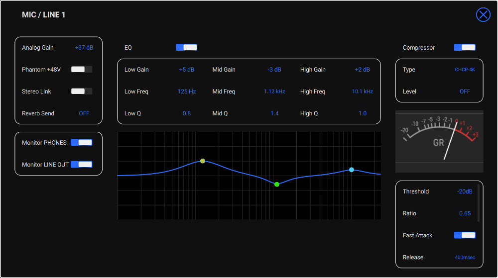 スタジオ機材モデリングによる高品質なエフェクト機能(リバーブ、コンプレッサー)を内蔵し、各チャンネルごとのEQ調節も可能。