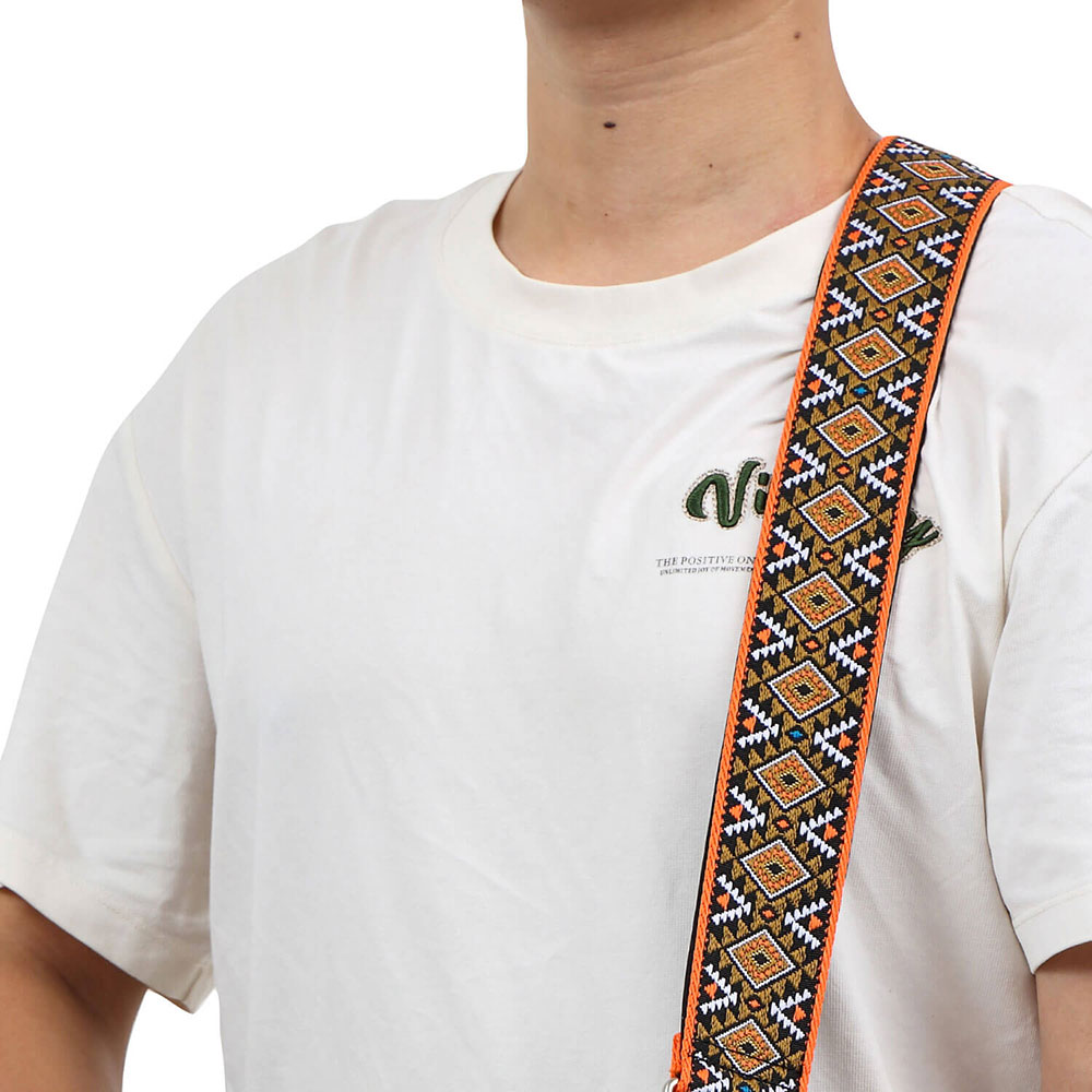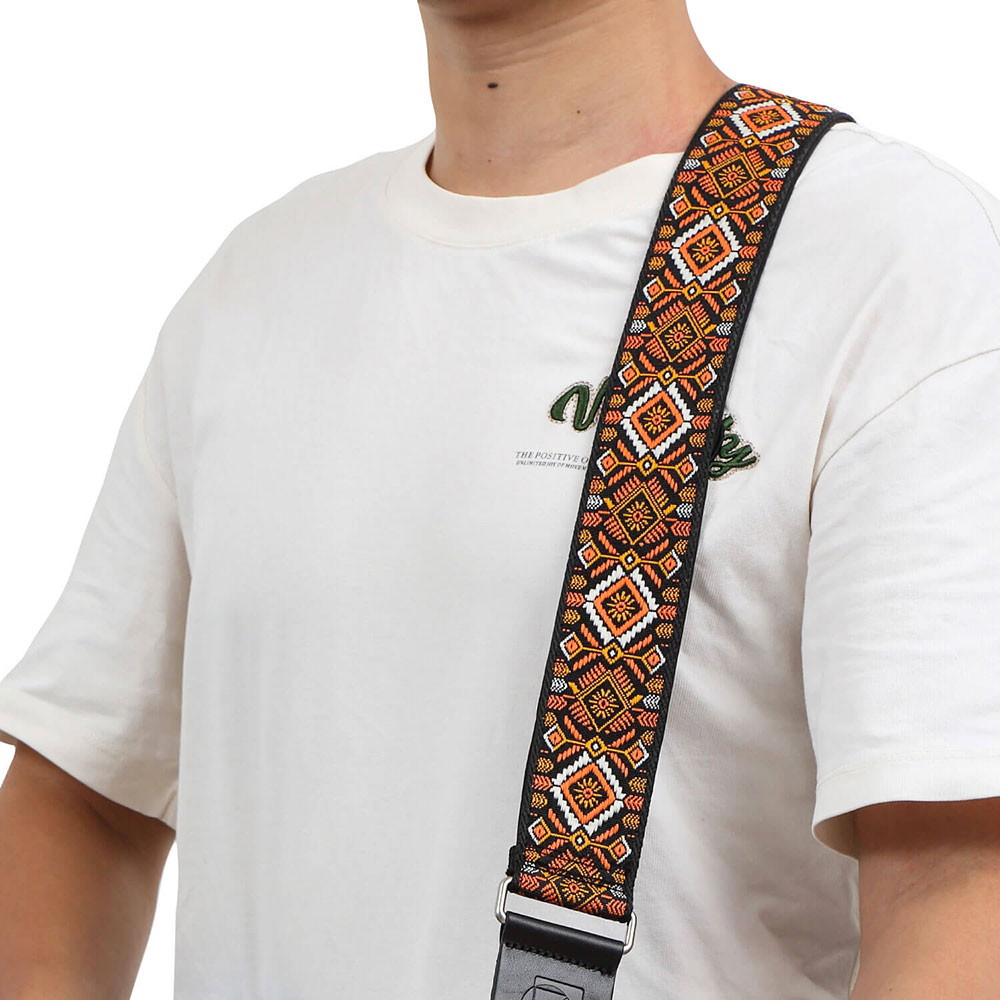 - デザイン:エスニックなパターンが特徴で、多様なギターや服装に合わせやすい。