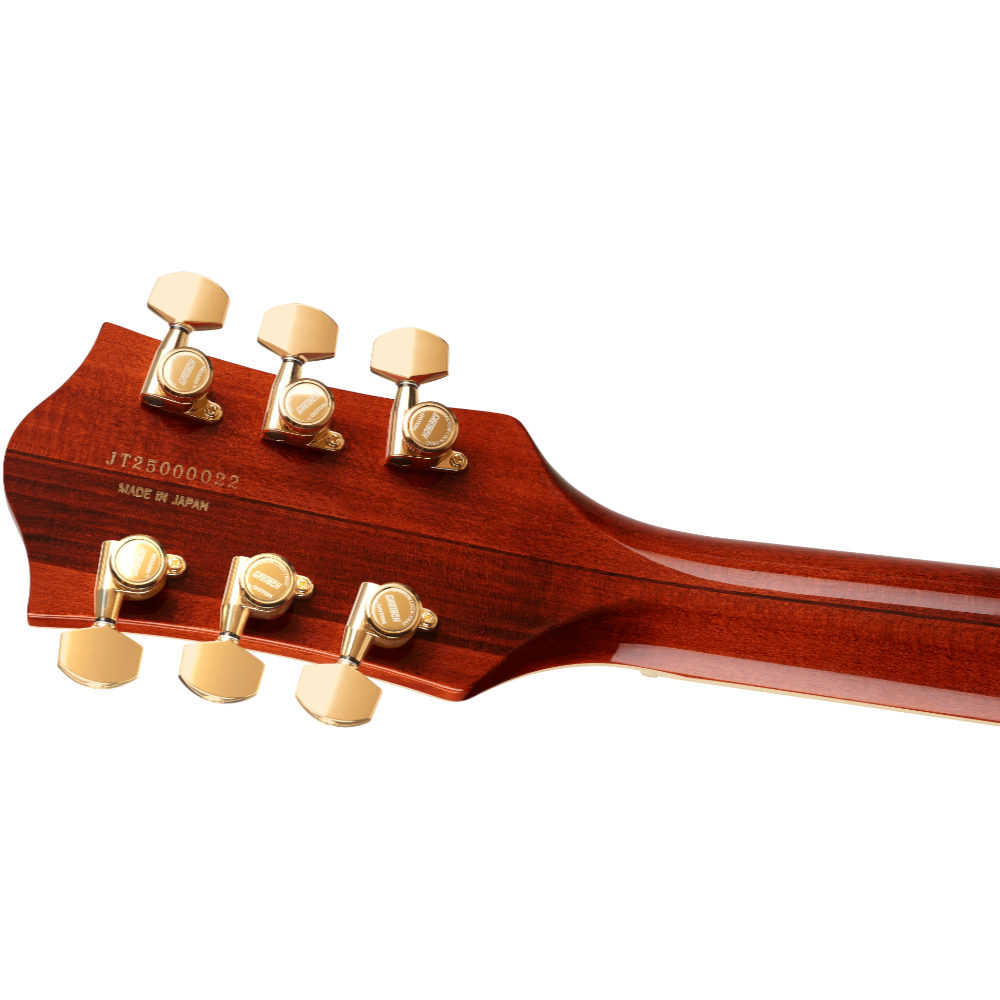 Pro Twin Sixピックアップは、Gretsch史上最もモダンかつパワフルなピックアップのひとつです。ネックピックアップにはアルニコ5マグネットを採用し、DCR値(直流抵抗値)は約5.5kΩ。ウォームでクリアかつ喉鳴りのあるトーンを提供しながら、濁りや過度なコンプレッション感はありません。ブリッジピックアップにはアルニコ4マグネットを採用し、DCR値は約12kΩ。明るくクリアなサウンドに加え、強化されたミッドレンジのパンチ、タイトでフォーカスされたローエンド、そして決して耳に痛くならない煌びやかなハイエンドを実現します。これらのピックアップの組み合わせにより、卓越したパワー、忠実度、そして高い汎用性を備え、新たなサウンドテリトリーを自在に探求することが可能です。