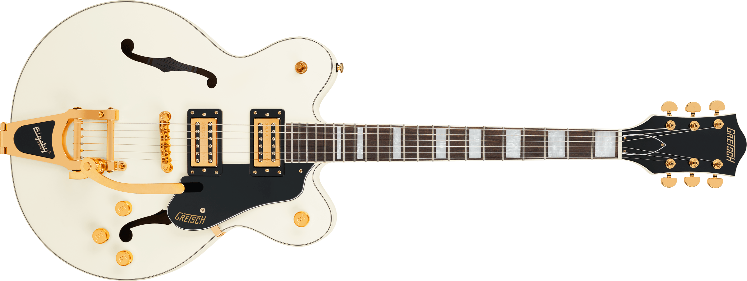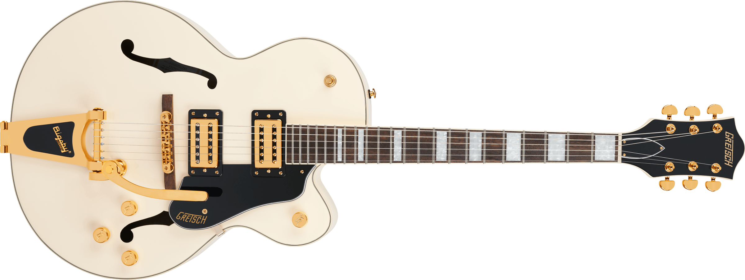 Limited Edition G2420TG Streamliner Hollow Body Single-Cut with Bigsbyは、高次元のサウンドとパフォーマンスを求める現代のギタリストのために設計されています。エレガントなゴールドハードウェア、メタル”Gアロー”コントロールノブ、パーロイド”Big Block”インレイを採用したG2420TGは、モダンなサウンド、最新のエレクトロニクス、正真正銘のエレガントなスタイリングをフィーチャーし、”That Great Gretsch Sound!”を体現する、大胆なプレイヤーの欲求を満たすギターです。