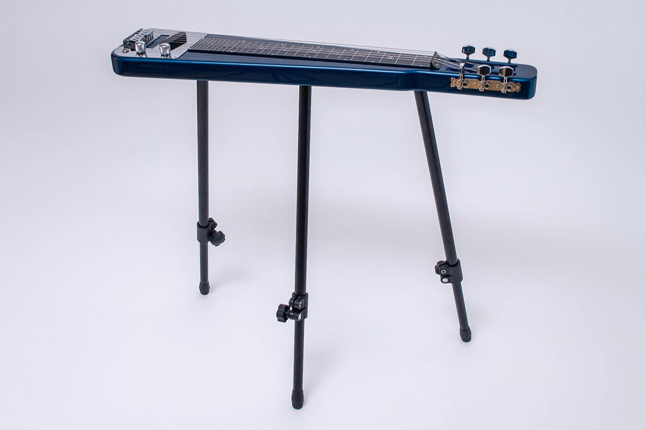 膝の上に乗せての演奏、またスタンディングスタイルでの演奏も出来るように専用のスタンドが付属。