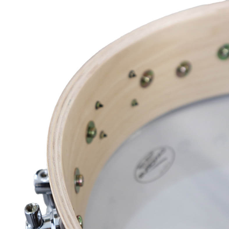本モデルは、バターサイド12テンション、スネアサイド6テンションという一部のヴィンテージドラムで採用されていた仕様を、取り回しに優れたピッコロサイズに落とし込んでいます。トップの多テンション構造が生み出すタイトで引き締まったアタックに対し、ボトムはピッチを上げても余裕を保つ設計とすることで、ミッドレンジの存在感を的確に強調。さらにラウンドエッジフープの効果により、余計なサスティーンを抑えながら、締まった塊感と自然なまとまりを付加しています。その結果、ピッコロならではの素早いレスポンスを維持しながらも、まるで深胴スネアのような奥行きと芯のあるトーンを実現しました。